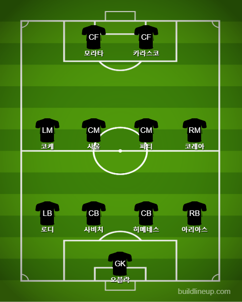 이번 경기에서 아쉬운 점은 펠릭스 선수가 부상으로 의심되는 상황이기 때문에 출전 여부가 확실하지 않은 상황입니다. 확실한 크랙 역할로 공격진영에 다이내믹함을 올려주는 펠릭스 선수의 공백이 아쉬운 아틀레티코 마드리드입니다. 디에고 코스타 또한 출전이 불가능한 상태이기 때문에 선발 출전으로 예상되는 모라타 선수와 카라스코 선수의 확실한 골 결정력이 필요한 경기입니다.