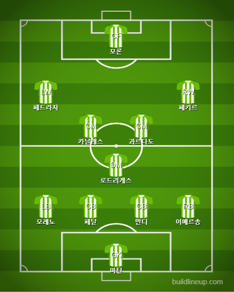레알 베티스의 최근 분위기는 나쁘지 않습니다. 최근 2연속 패배를 끊고 1승 1 무를 기록하고 있는 레알 베티스입니다. 레알 베티스는 아틀레티코 마드리드를 상대로 433 전술로 나올 확률이 큽니다. 조금은 공격적인 전술로 아틀레티코 마드리드의 수비망을 뚫기 위해 노력할 레알 베티스 선수들입니다. 선발 출전으로 예상되는 모론 선수의 활약이 기대됩니다. 모론 선수는 최전방 공격수로서 팀 내 최다 득점자입니다. 9골을 기록하고 있는 준수한 공격수입니다.