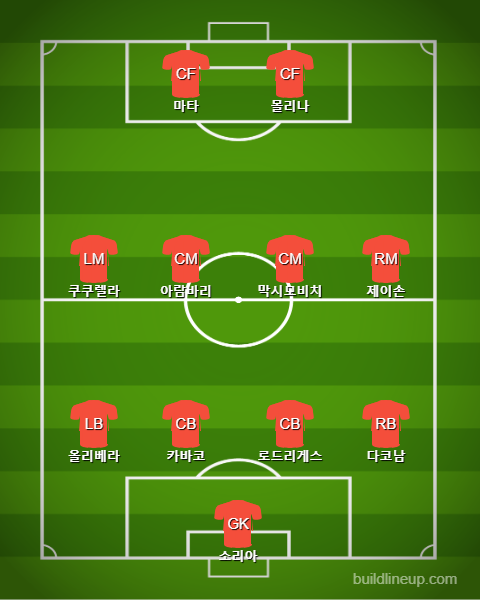 헤타페도 마찬가지로 최전방에 있는 투톱 선수의 침투와 활발한 활동력을 기대하고 있습니다. 마타 선수는 선발 출전이 예상되는데 팀 내 최다 득점자로서 11골을 기록하고 있습니다. 2위인 주전 로드리게스 선수는 경고 누적 상황으로 출전을 못하는 상황이기에 이를 대신해서 몰리나 선수가 선발 출전할 것으로 예상됩니다. 최전방 공격수들의 확실한 집중력이 필요한 경기입니다.