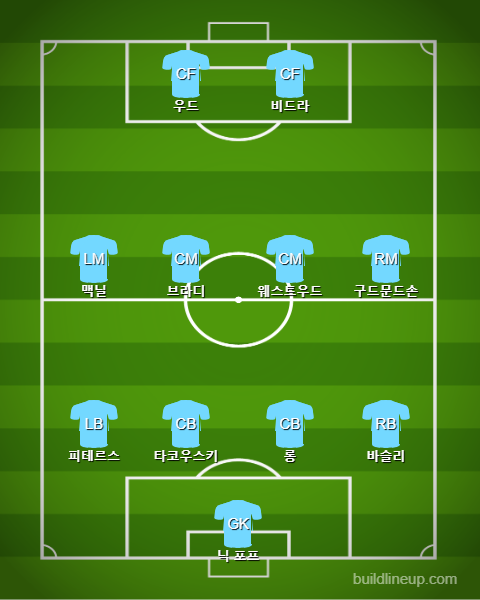 442 전술의 경우 투 톱의 확실한 공격능력이 아주 중요한 포메이션입니다. 팀 내 최다 득점자인 크리스 우드의 집중력 있는 골 결정력이 아주 중요한 경기입니다.