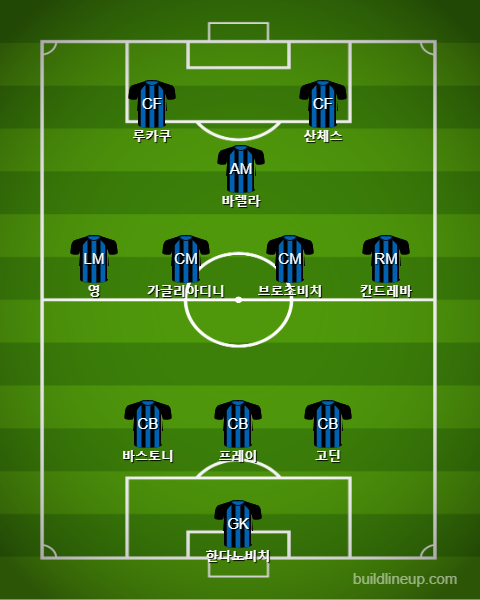 인터밀란은 헤타페를 상대로 3412 전술을 들고 올 것으로 예상이 됩니다. 안정적인 3백을 구축한 뒤에 천천히 점유율을 올리는 축구를 할 것으로 예상이 됩니다. 최전방 공격수로 출전을 할 루카쿠와 산체스 선수의 호흡이 기대되는 경기입니다. 최근 산체스도 인터밀란과 정식 계약이 마무리되어가는 가운데 맨유 때부터 호흡을 맞췄던 루카쿠 선수와 좋은 모습을 보일 것으로 기대가 됩니다. 빅 앤 스몰 조합을 통해서 상대 수비라인의 혼돈을 만들어줄 수 있는 선수들입니다.