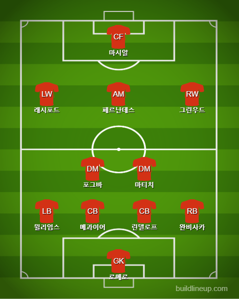 맨체스터 유나이티드는 늘 그렇듯 같은 포메이션을 유지할 것으로 예상이 됩니다. 4231 전술을 통해서 후방에 마티치만 내리고 윌리엄스와 완 비사카를 올리면서 삼각형 모양으로 센터백과 마티치 선수가 함께 빌드업을 할 것으로 예상이 됩니다. 맨유의 현재 가장 아쉬운 점은 루크 쇼 선수가 부상으로 출전하지 못한다는 사실입니다. 맨유의 유스 출신 수비수인 윌리엄스가 그 자리를 잘 메꿔서 윙백 역할을 잘 수행해주고 있긴 하지만 높은 투지에 비해서 침착한 모습이 부족한 장면들이 종종 나오고 있습니다. 윌리엄스 선수의 침착한 대응이 맨유의 수비라인의 붕괴를 막을 수 있다고 생각합니다. 루크 쇼 선수와 조금 다른 점은 공격 진행할 때의 모습입니다. 윌리엄스는 오버래핑보다 언더 래핑을 많이 시도하고 있습니다. 언더 래핑을 통해서 공격 진영의 숫자를 순간적으로 많이 늘려주고 있습니다.