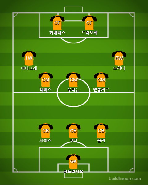 울버햄튼은 세비야를 맞이해서 352 전술을 준비해올 것으로 기대가 됩니다. 이번 시즌 리그에서도 꾸준하게 352 전술을 통해서 안정적인 3백 수비 라인을 갖춘 상태에서 경기 운영이 많았던 울버햄튼 원더러스입니다. 기본적으로 343 전술이 많았던 울버햄튼이지만 세비야를 맞이해서 더욱 수비적인 모습을 보이기 위해서 352 전술을 준비해올 것으로 예상이 됩니다. 중원에 숫자를 많이 둠으로써 윙백 선수들의 안정적인 수비 유지를 많이 보여줄 것으로 예상이 됩니다. 5백 수비라인까지 내려서 세비야의 발 빠른 윙어 선수들의 발을 묶기 위해 노력할 울버햄튼입니다.