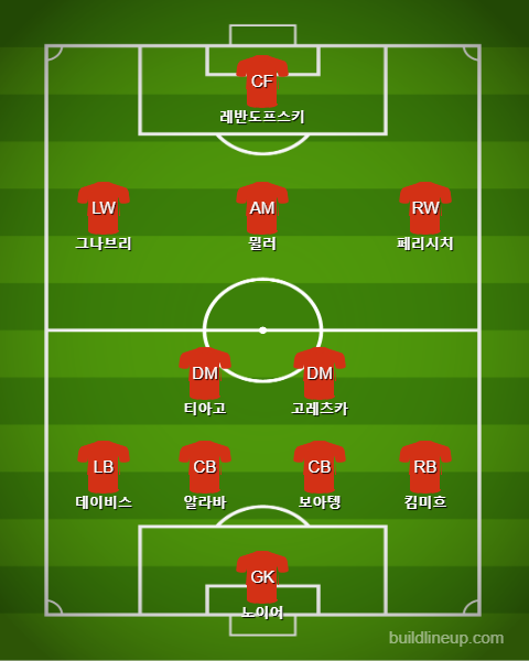 2선에 공격형 미드필더로 출전이 예상되고 있는 뮐러 선수 또한 제2의 전성기를 보내고 있다는 평가를 받고 있을 만큼 공격 진영에서 자연스러운 흐름을 꾸준히 유지시켜주는 선수입니다. 또한 결정적인 패스 찬스를 줄 수 있는 선수이기 때문에 상대팀 수비수들이 막기 대단히 어렵습니다. 포메이션에 배치되어 있는 모든 선수들의 폼이 아주 좋은 상황입니다. 마지막 노이어 선수까지 대단한 폼을 보여주고 있습니다.