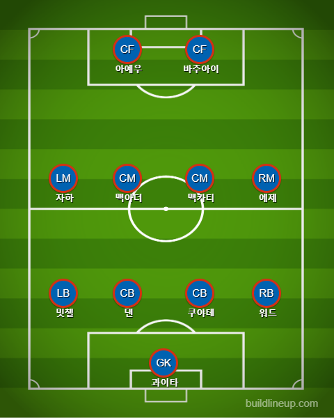 맨유를 상대로 442 전술을 준비해올 것으로 예상이 됩니다. 첫 경기에서 승리를 한 상태이기 때문에 선수들의 자신감이 상당히 좋을 것으로 예상이 됩니다. 전력상 맨유보다 아래이기 때문에 안정적인 수비 운영을 중점으로 경기를 이끌어나갈 것으로 예상이 됩니다. 2선과 3선의 간격을 최대한 좁혀서 맨체스터 유나이티드 공격진들이 자유로운 플레이를 할 수 없도록 막아낼 것으로 예상이 됩니다. 이번 시즌 새롭게 들어오게 된 바추아이 선수가 들어옴으로써 2 톱 형태의 공격을 운영할 수 있게 됐습니다. 에이스인 자하 선수를 중심으로 다채로운 공격 운영이 가능할 것으로 예상되고 있습니다.
